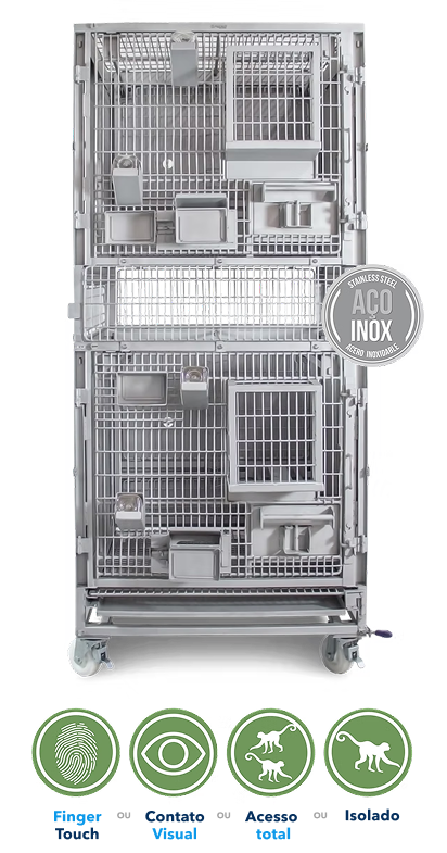 Construído em aço inoxidável AISI 304, o Rack para Primatas NHP foi projetado para atender às mais rigorosas exigências em instalações de pesquisa. Sua estrutura robusta alia durabilidade, segurança e facilidade de manutenção, com partes removíveis que simplificam a limpeza e a desinfecção.